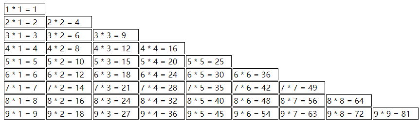 <!DOCTYPE html> <html> <head> <meta charset="UTF-8"> <title>99乘法表</title> <style type="text/css"> td{ border: 1px solid; } </style> <!--内部JS--> <script> document.write("<table align='center'>"); //1.完成基本的for循环嵌套,展示99乘法表 for (var i = 1; i <= 9 ; i++) { document.write("<tr>"); for (var j = 1; j <= i; j++) { document.write("<td>"); //输出 1 * 1 = 1 document.write(i + " * " + j + " = " + ( i*j) +" "); document.write("</td>"); } document.write("</tr>"); } //2.完成表格嵌套 document.write("</table>"); </script> </head> <body> </body> </html>