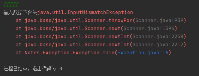 如图,输入ffff字符串,由于输入信息不属于int类型,进行了catch匹配,发现错误属于InputMismatchException类,将错误的信息存在引用类型的变量e中,接着执行catch中的语句,输出:输入数据不合法 (还有相应的错误路径信息)