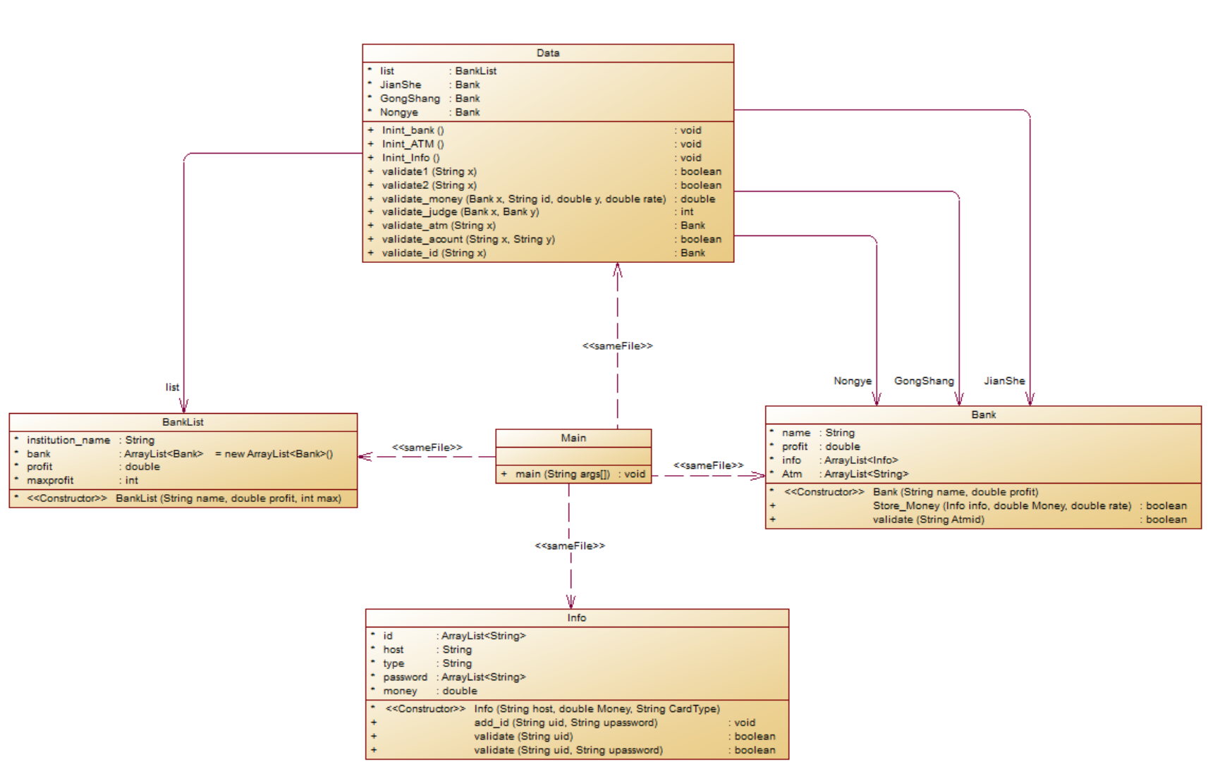 第二次与第一次不同在于属性上不同,结构上也略有不同,主要在于题目所对应的需求不一样,第一题并未对卡进行划分,也不实现跨行转账,因此功能模式比较单一,使用简单的两层结构就能对其进行实现而第二次设计增加了透支消费,卡类别划分,对不同卡实现同一件事情的结果不同,最主要时需要采用开闭原则,对扩展开放,对修改关闭。因此类别设计的时候就需要增加一个类来对银行功能的扩展,而对修改数据进行关闭,对后续如果要对银行机构产生相关行为,依然能够使用该模式进行扩展。