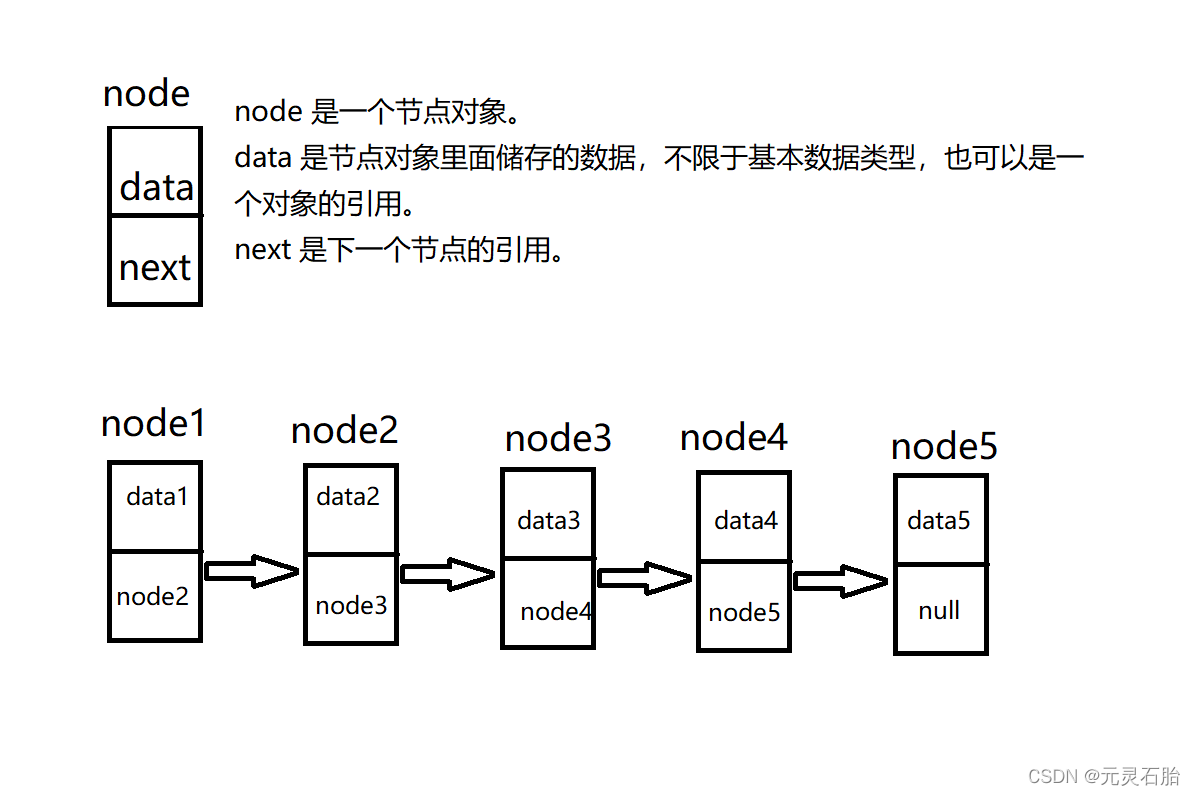 单向链表由一个个的节点组成,这些节点都带有下一个节点的引用,最后一个节点指向null,这样就将每一个节点单向的串了起来。因此我们只需要拿到一个链表的头节点,即可遍历整个链表。