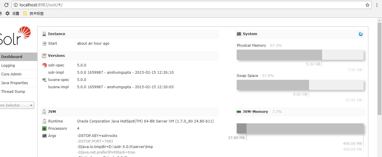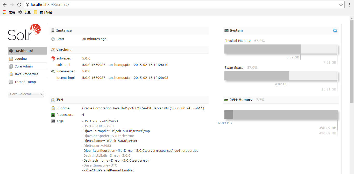看到这个页面就完成solr的启动了。
