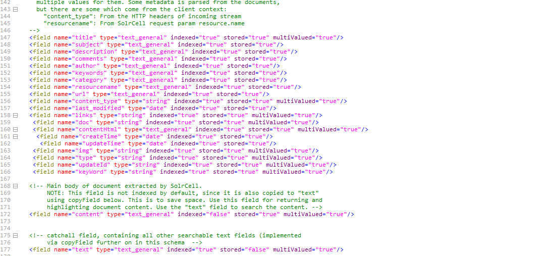 在这里面我们可以看看我们solr服务器中默认给我们的字段,如果你需要别的字段,只需要,添加 field 然后name定义你想要的字段就行,