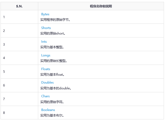 作为Java的原语类型,不能用来传递在泛型或于类别作为输入。Guava提供大量包装工具类来处理原始类型的对象。以下是有用的原始处理工具的列表: