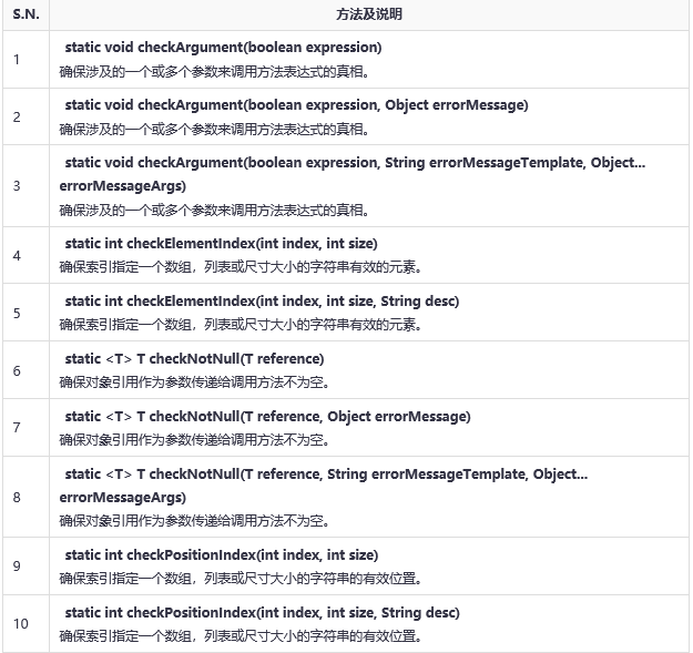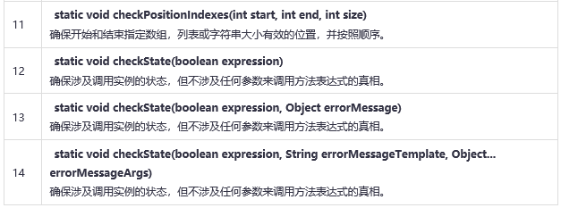 Preconditions提供静态方法来检查方法或构造函数,被调用是否给定适当的参数。它检查的先决条件。其方法失败抛出IllegalArgumentException。