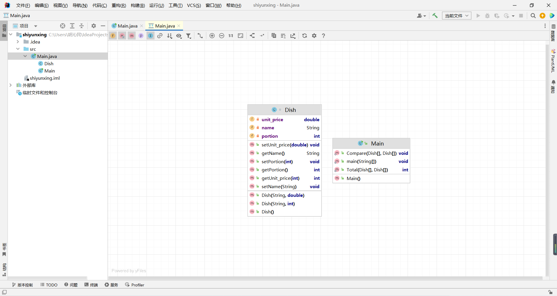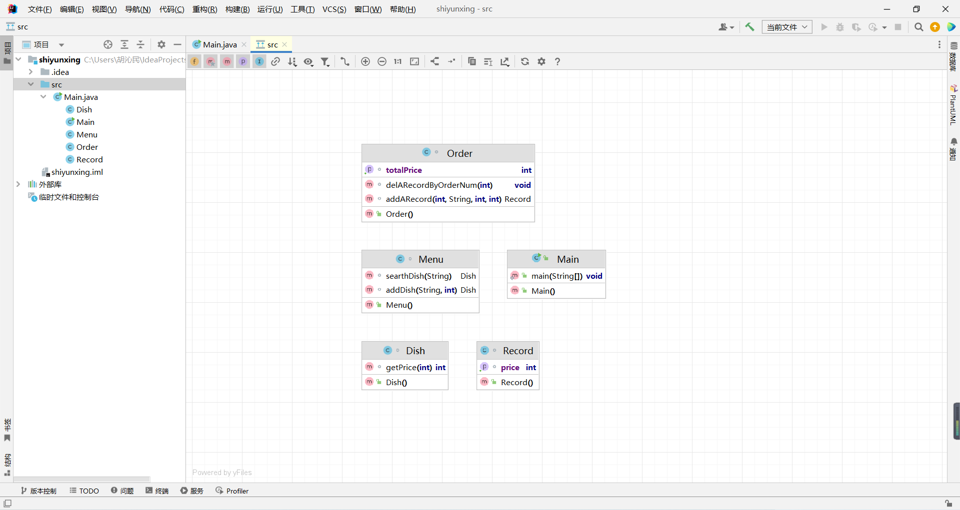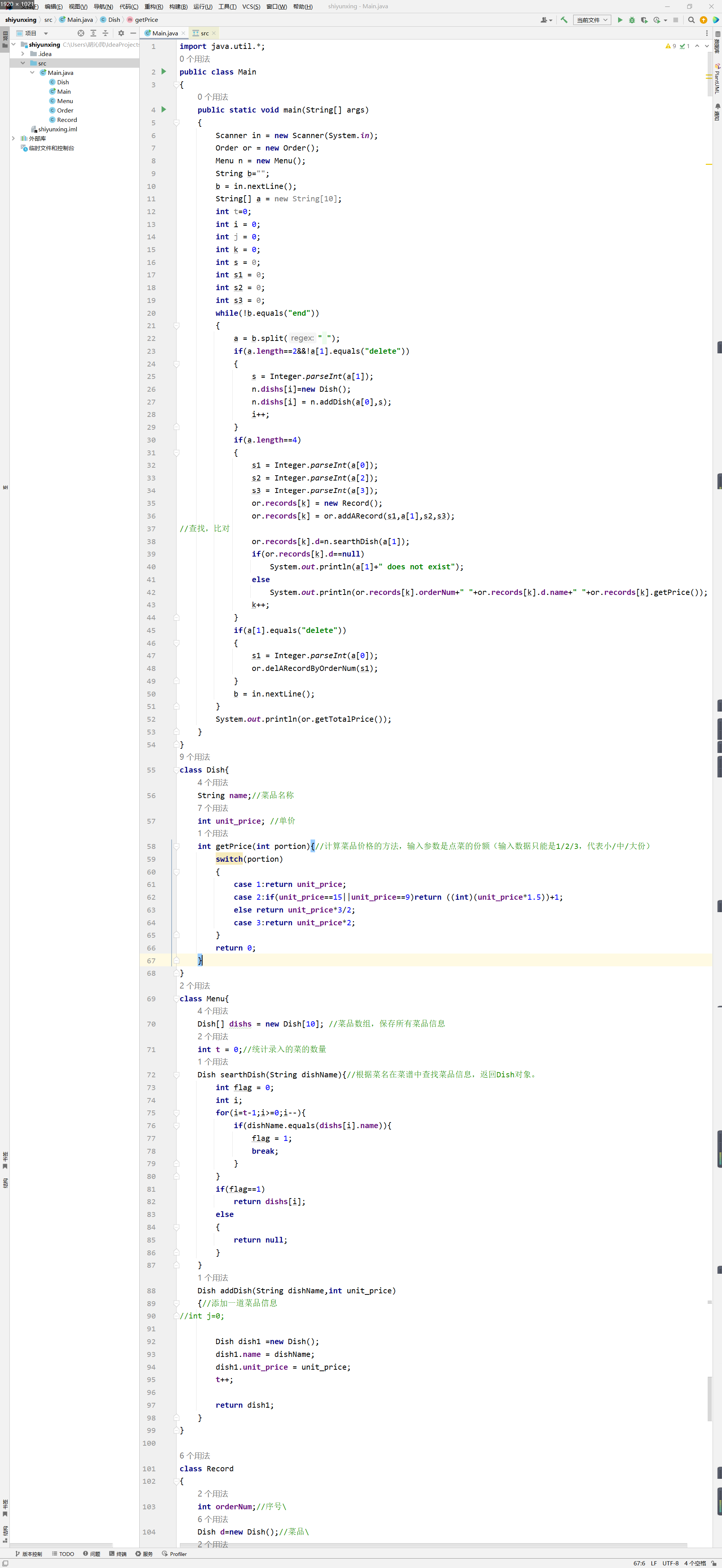 Order { Record[] records;//保存订单上每一道的记录 int getTotalPrice()//计算订单的总价 Record addARecord(int orderNum,String dishName,int portion,int num)//添加一条菜品信息到订单中。 delARecordByOrderNum(int orderNum)//根据序号删除一条记录 findRecordByNum(int orderNum)//根据序号查找一条记录 }