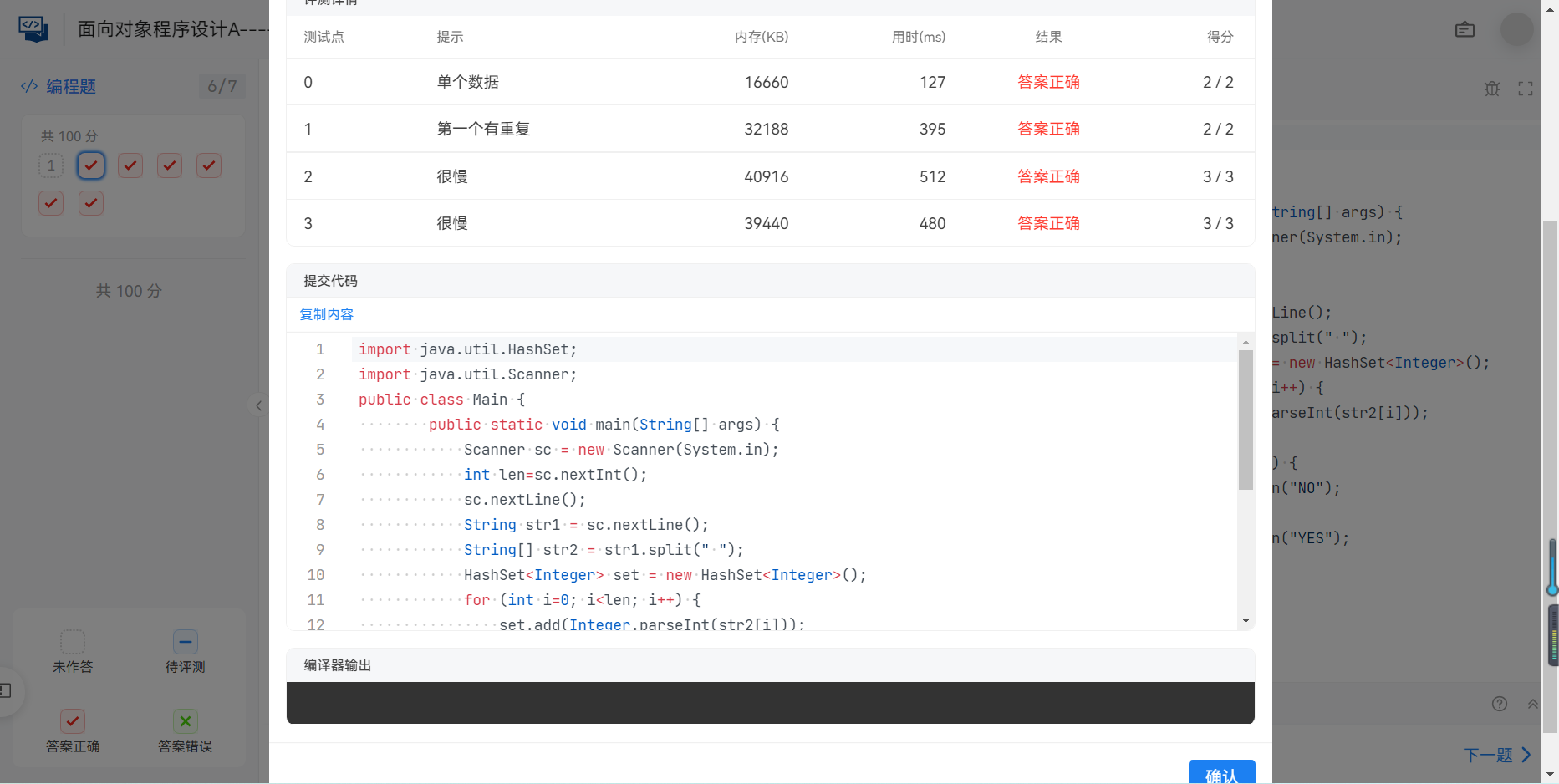该题如果使用原本的暴力循环判断的话,一定会有一个测试点过不了,导致无法满分,因此需要使用到HashSet类对输入的数据进行默认去重,然后使用常规方法判断即可。