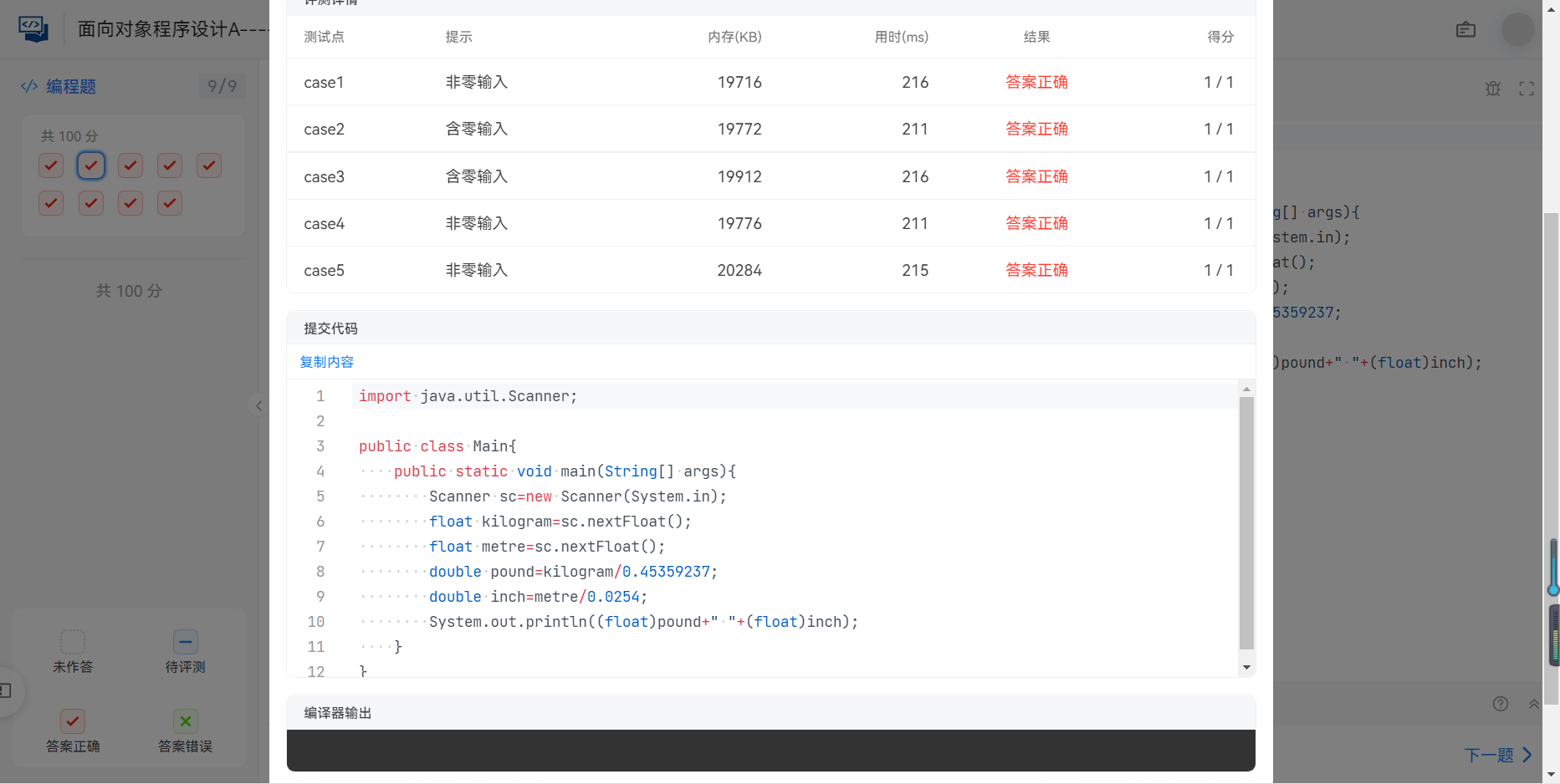 2.在计算长度的题目中,由于一开始审题不清楚,没有将计算得出的数据保留一位小数,导致题目错误,最后在答案处用float进行强制类型转化即可。以下为需改后的运行结果: