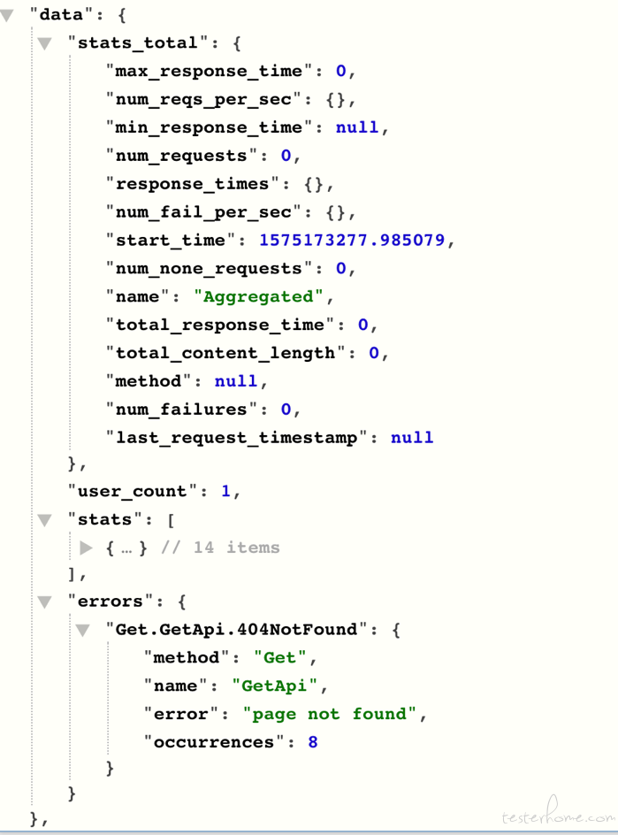 其中每一个locust进程会维护一个全局RequestStats单例global_stats,这个实例包含一个StatsEntry实例total(对应json的stats_total),以及两个字典entries(对应json的stats)和errors(对应json的errors),其中entries字典key为(name,method),对应值为一个StatsEntry实例,另一个errors字典的key为(name,method,error),对应值为一个StatsError实例。可见,global_stats包含了单个slave汇总的信息,以及各个请求url或name的统计信息。在分布式的场景下,每个slave都会维护一个global_stats, 在一个上报周期达到后将信息发送到master,发送完成后就会重置所有数据,进入下一个周期的统计。