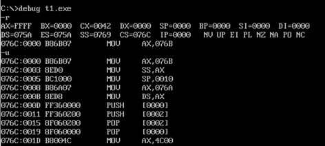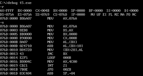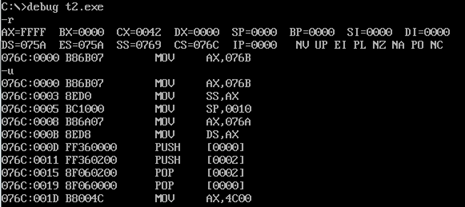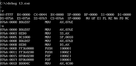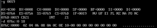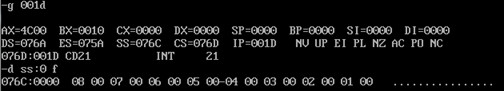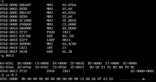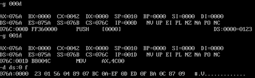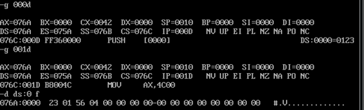 2.同1,先r命令查看u命令反汇编,g命令执行后d命令查看。