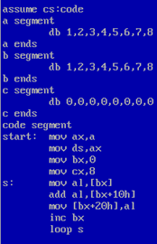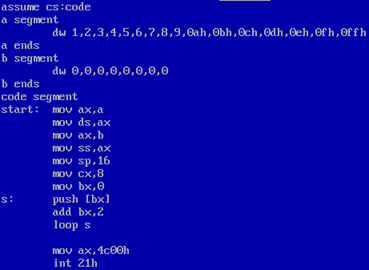 在本次实验中主要联系了有关含多个段的程序的内容,实验起来较前几次比较简单,但操作比较复杂。需要先用u命令反汇编观察后,再用g命令详细执行,最后使用d命令具体查看结果。锻炼了我对于多段的源代码逐步操作debug的能力。