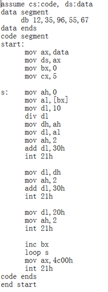 任务2:补全程序 t2.asm,完成在屏幕上输出 data 段定义的 5 个十进制两位数,数据和数据之间以空格间隔。