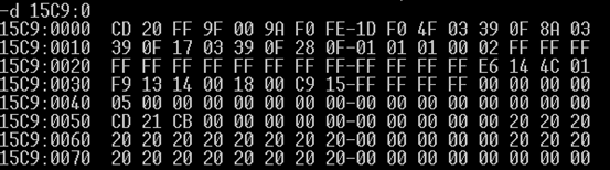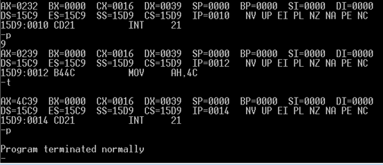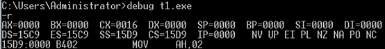 ①使用r命令查看,观察cx值为0016,ds和cs的值分别为15c9和15d9,满足关系(cs)=(ds)+10h。
