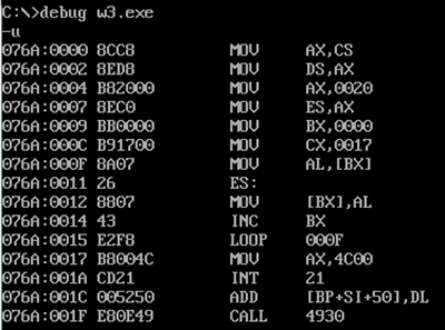 发现mov ax,4c00h在076a:0017处,故将17h赋值给cx。