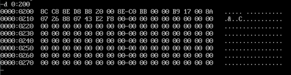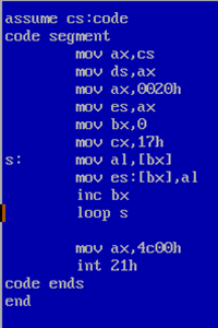 将“mov ax,4cooh”之前的指令复制到内存0:200处并补全程序。