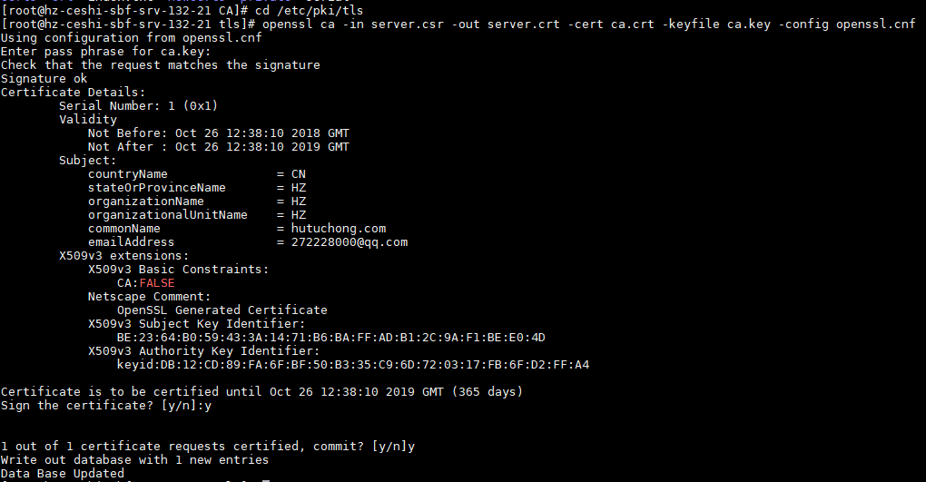 openssl ca -in server.csr -out server.crt -cert ca.crt -keyfile ca.key -config openssl.cnf