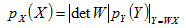 设X为n维随机向量,其pdf为p(X)。线性变换Y=WX,W为满秩n*n维矩阵。这样,Y也是n维随机向量,其pdf为p(Y)。这两个随机向量的pdf之间满足下列关系: