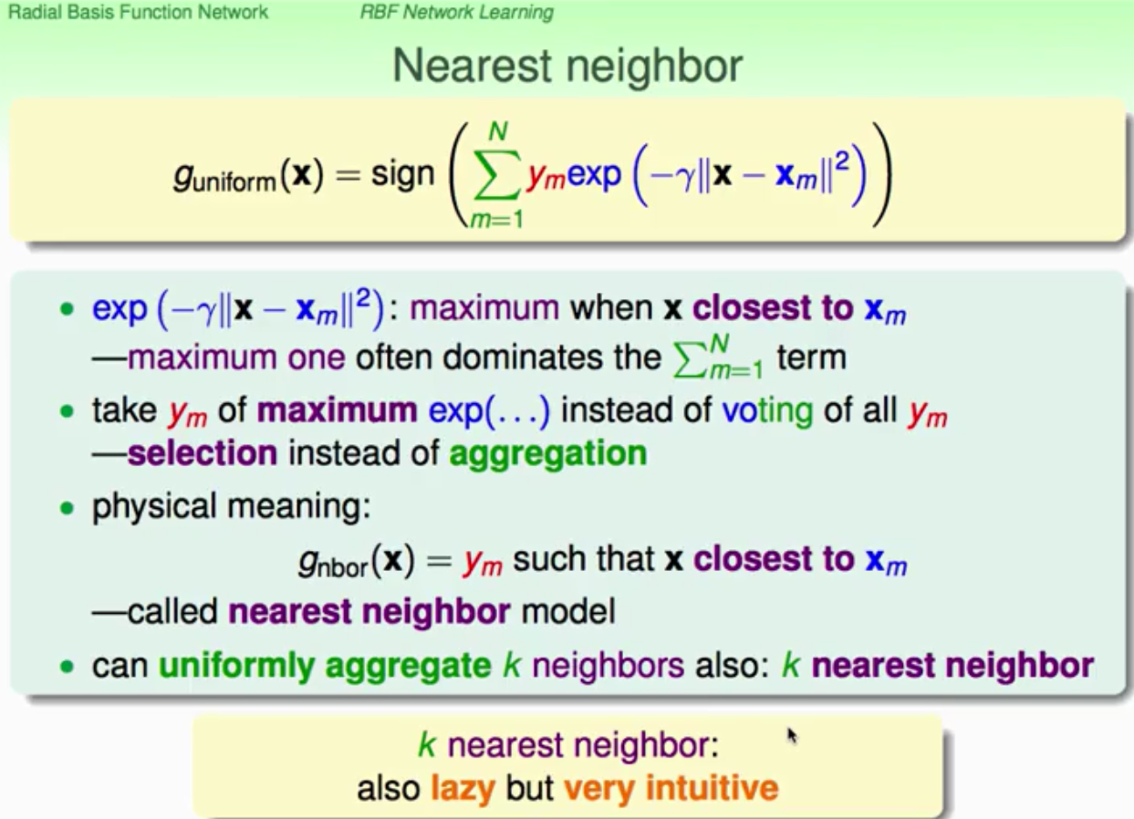 思想就是我们对所有经过hypothesis得到的输出进行投票(vote,aggregation),而是选择在相似度上与已知样本点最近的那个点的标签作为输出。这就是典型的最近邻模型。所以这样看上去训练就比较简单了,实际上只用把观测到的数据保存下来就好,但测试过程则比较复杂,因为要对所有的已知标签的样本点进行相似度的计算,然后选出最近邻的那个,并输出该样本的标签。稍微拓展一下,我们还是可以做融合的,我们选出最相似的k个邻居,然后由着k个邻居进行投票,或者线性融合,然后再输出,这样的模型就叫做k最近邻模型。