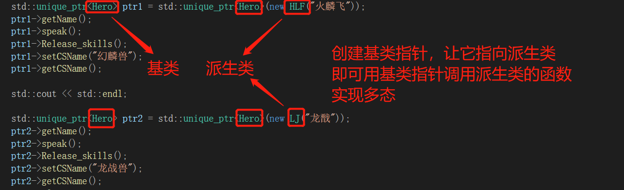 1 /* 2 多态:父类虚函数、子类重写虚函数 3 类之间的关系强弱顺序:继承(泛化)> 组合 > 聚合 > 关联 > 依赖 4 关联的两个对象之间一般是平等的,聚合则一般不平等 5 关联关系:表示两个对象之间的一种简单的联系,如朋友之间,关系平等 6 聚合关系:独立存在,如人和书之间 7 组合关系:不能独立存在,如人和心脏之间 8 */ 9 #include "iostream" 10 class Hero 11 { 12 public: 13 Hero(std::string Name) : m_Name(Name) 14 { 15 } 16 virtual void Release_skills() { std::cout << "释放技能" << std::endl; } 17 virtual void speak() { std::cout << "说话" << std::endl; } 18 19 virtual std::string getName() = 0; //纯虚函数、子类必须重写,否则无法实例化 20 21 virtual void setCSName(std::string CSNamse) //虚函数、可以不在子类中进行重写 22 { 23 m_CSName = CSNamse; 24 } 25 virtual std::string getCSName() 26 { 27 std::cout << "我的超兽是:" << m_CSName.c_str() << std::endl; 28 return m_CSName; 29 } 30 protected: 31 std::string m_Name = ""; 32 std::string m_CSName = ""; 33 }; 34 35 class HLF : public Hero 36 { 37 public: 38 HLF(std::string Name) : Hero(Name) //委托构造函数 39 { 40 } 41 std::string getName() 42 { 43 std::cout << "我的名字是:" << m_Name.c_str() << std::endl; 44 return m_Name; 45 } 46 virtual void Release_skills()override //override表示重写虚函数以及检验虚函数名称是否正确 47 { 48 std::cout << "释放技能:火灵诀" << std::endl; 49 } 50 virtual void speak()override 51 { 52 std::cout << "敌人在我面前不是逃之夭夭,就是一败涂地 " << std::endl; 53 } 54 55 }; 56 57 class LJ :public Hero 58 { 59 public: 60 LJ(std::string Name) : Hero(Name) 61 { 62 } 63 virtual void Release_skills() 64 { 65 std::cout << "释放技能:寒影诀" << std::endl; 66 } 67 virtual void speak() 68 { 69 std::cout << "攻敌三分,自留七分 " << std::endl; 70 } 71 std::string getName() 72 { 73 std::cout << "我的名字是:" << m_Name.c_str() << std::endl; 74 return m_Name; 75 } 76 }; 77 78 int main() 79 { 80 //创建基类指针,让它指向派生类对象,用基类指针调用派生类的成员函数 81 std::unique_ptr<Hero> ptr1 = std::unique_ptr<Hero>(new HLF("火麟飞")); 82 ptr1->getName(); 83 ptr1->speak(); 84 ptr1->Release_skills(); 85 ptr1->setCSName("幻麟兽"); 86 ptr1->getCSName(); 87 88 std::cout << std::endl; 89 90 std::unique_ptr<Hero> ptr2 = std::unique_ptr<Hero>(new LJ("龙戬")); 91 ptr2->getName(); 92 ptr2->speak(); 93 ptr2->Release_skills(); 94 ptr2->setCSName("龙战兽"); 95 ptr2->getCSName(); 96 return 0; 97 }