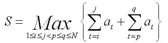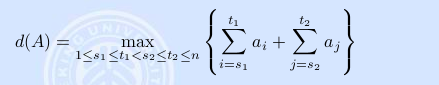 这里我们分别从前往后(dp1)和从后往前(dp2)求解最大连续子串和,然后设置一个rtm[i]代表取后i个元素之中最大连续子串的和,最大的dp1[i - 1] + rtm[i]。