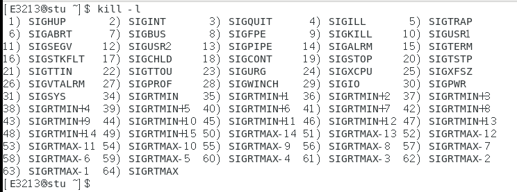 2) 另外再开启一个终端,在终端通过输入 kill 命令来给进程发送信号,可以在终端通过输入 kill -l 来查看当前系统当中的信号列表: