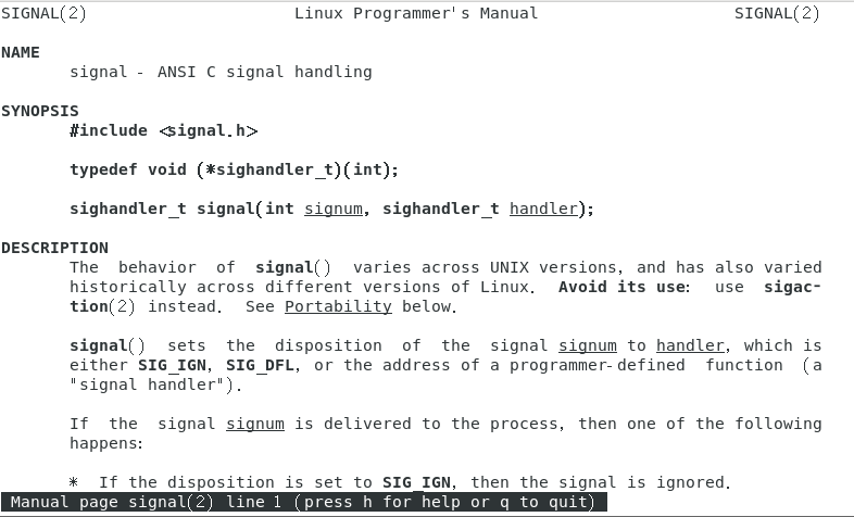 可以 通过 signal() 来改变进程对某个信号的处置方式。通过查看手册: man 2 signal
