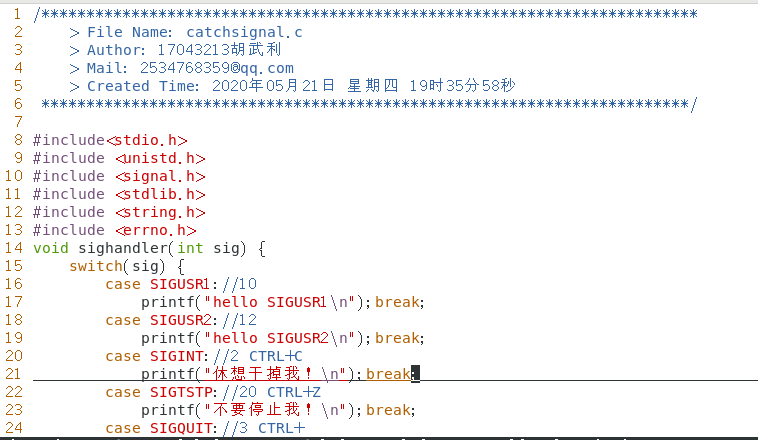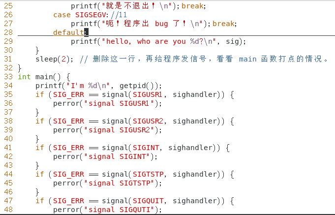输入完上述代码,编译并运行,然后再给该进程发送信号,观察进程对接收到信号的反应: