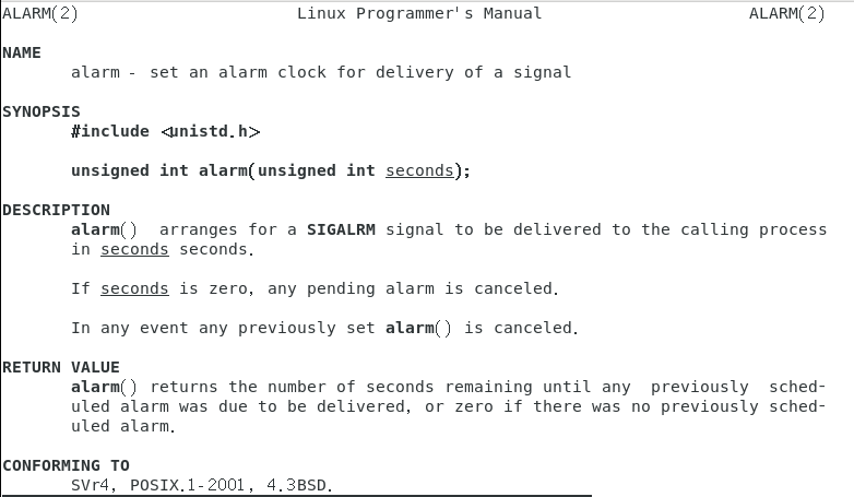 从上面可以看到 alarm() 函数在计时结束后会发生 SIGALRM 信号给当前进程,进程对 SIGALRM 信号的缺省动作是结束进程。