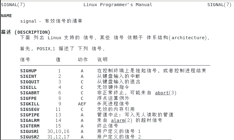 通过命令 man 7 signal 可以查看当前系统信号的清单: