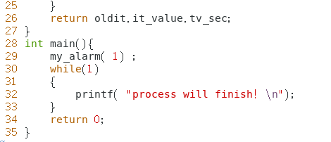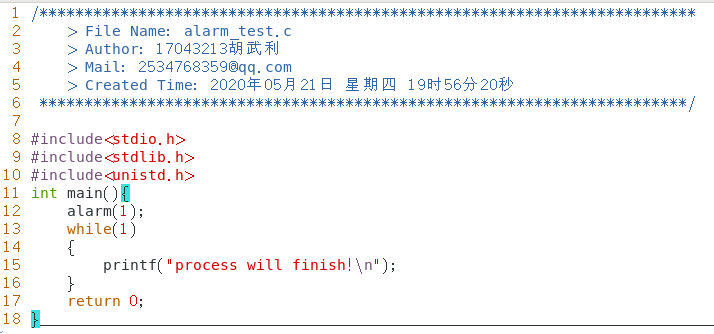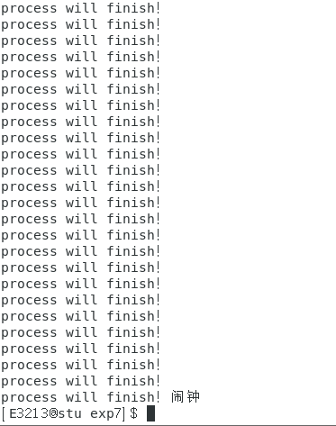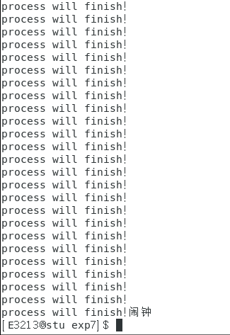 虽然程序中有无限循环,不断输出字符串 process will finish! ,由于调用了 alarm(1) 函数,alarm 函数会在1秒后给该进程发送 SIGALRM 信号,然后进程结束。