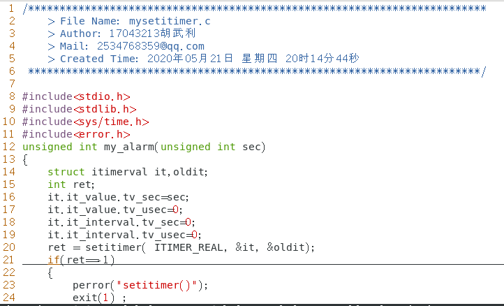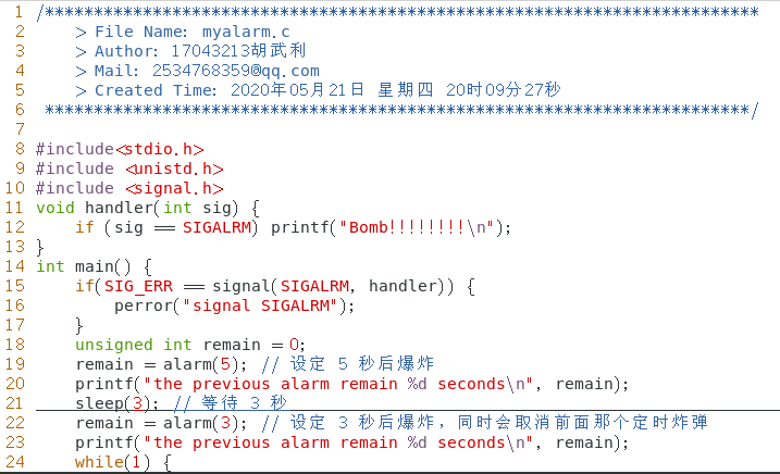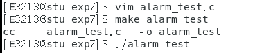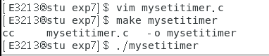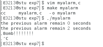 这里计时时间到了并不会结束进程,因为编写了信号捕捉函数,产生 SIGALRM 信号后会输出字符串 Bomb!! , 可以键盘按键组合结束进程,接下来用 setitimer() 函数实现 alarm() 函数: