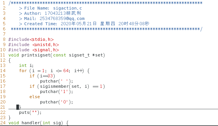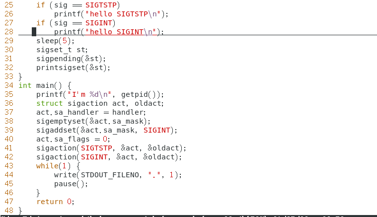 下面给出一个程序来说明 sigaction() 函数的使用,程序注册了信号 SIGINT 和 SIGTSTP . 需要注意的一点是 sa_mask 被设置为 SIGINT ,它表示当执行信号处理函数的时候,阻塞信 SIGINT 信号。在 handler 函数加入了一打印未决信号的功能,以验证执行到 handler 的时候发送 SIGINT 是被阻塞住的。