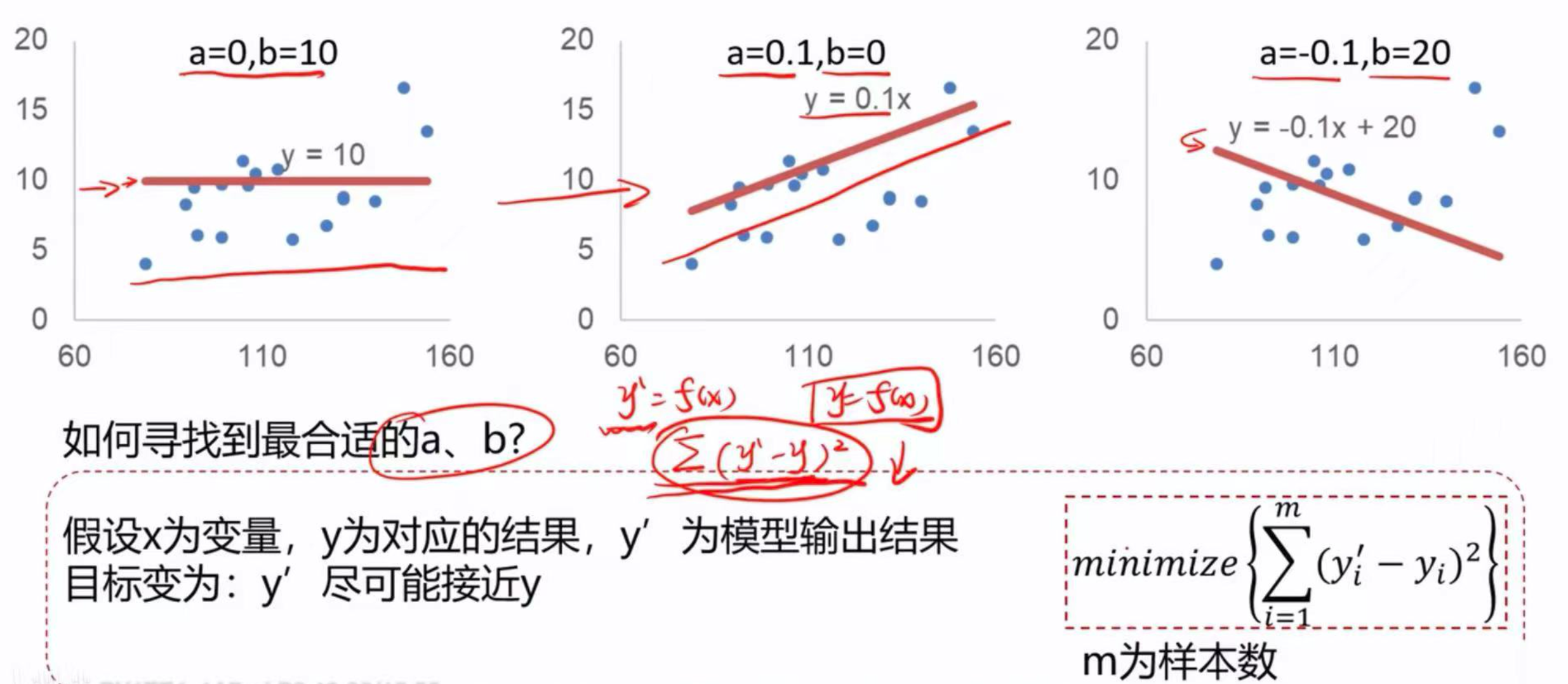 在这里,我们目标就是寻找到最合适的a和b,来让我们建立的线性数学模型中同一个x求出的\(\mathrm{y}^{\prime}\)能够尽量接近真实的y。