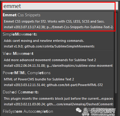 开始安装一些其他非常实用的插件吧,Ctrl+Shift+P(菜单 – Tools – Command Paletter),输入 install 选中Install Package并回车,输入或选择你需要的插件回车就安装了(注意左下角的小文字变化,会提示安装成功),安装其它插件也是这个方法,非常快速。