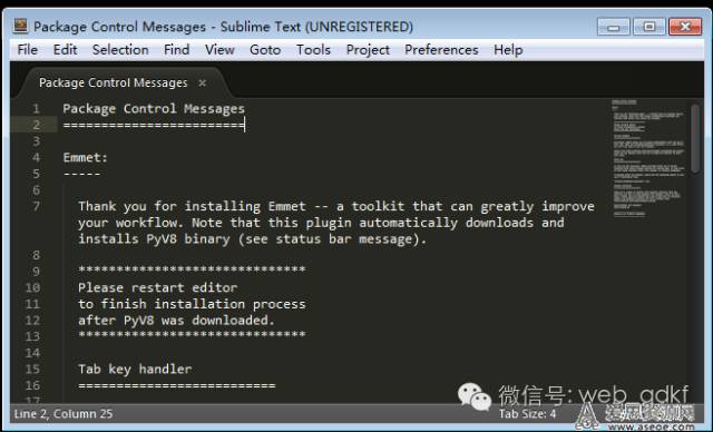 在 Emmet 安装完成后,会显示如下屏幕:然后会自动安装PyV8,安装完成,重启 Sublime Text 3。