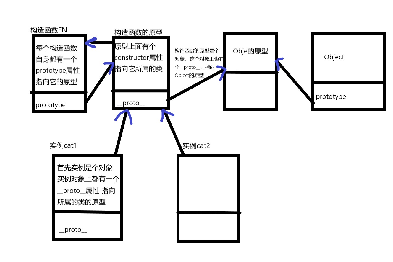 //用代码验证构造函数的原型 指向它所属的类 console.log(Cat.prototype.constructor == Cat);//true // 实例对象上的__proto__指向他所属类的原型 console.log(cat1.__proto__ == Cat.prototype);//true //构造函数原型上的__proto__ 指向object的原型 console.log(Cat.prototype.__proto__ == Object.prototype);//true //实例上的__proto__属性上的__proto__指向object的原型 console.log(cat1.__proto__.__proto__ === Object.prototype)//true
