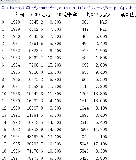 1.按行输出每年GDP数据,表头列名如文件第1行所示。