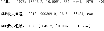 3.遍历字典数据,求出GDP的最小值与最大值,并输出数据与对应的年份。