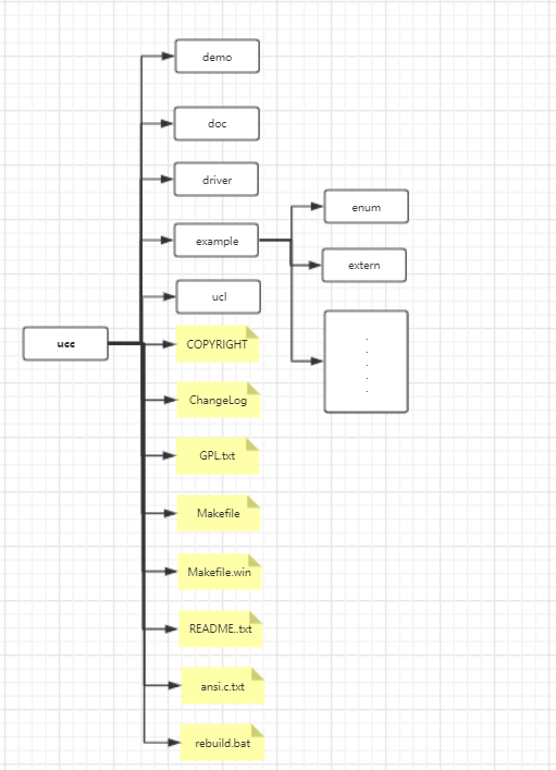 白色矩形框为文件夹,黄色为文件。作者把GPL文件、Makefile、readme文件都放在主目录ucc下,每部分的代码都分成不同文件夹,对项目的操作以及项目的相关信息都可以在主目录下找到,这么做十分方便有关源程序的存储、查询、编译、链接等工作。对整个项目的管理都集中在Makefile里,如项目的编译、连接等。每个项目都要有readme文件,所有对项目的说明都集中在README里。作者还设置了测试目录example,所有关键字的测试都在这个目录下进行。但是作者没有设置工具目录,无法很好的存放文件编辑器等工具的信息。此外作者没有设置了doc文件夹存放项目的相关文件如图片等,不是一个好选择
