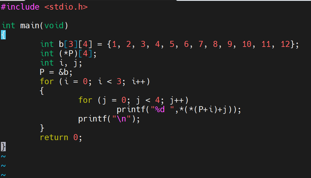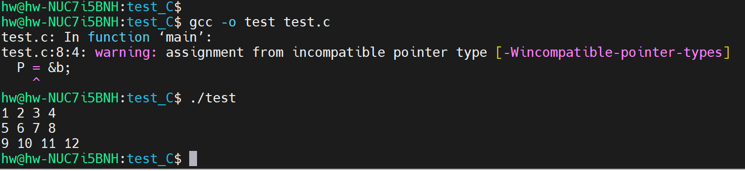 这个运行结果大致意思是说,*P[4] 是一个装了四个数组的指针的数组(即数组首地址,二维数组中就是每一行的行首地址)。这里只用二维数组做了验证,其实就相当于多个一维数组而已。