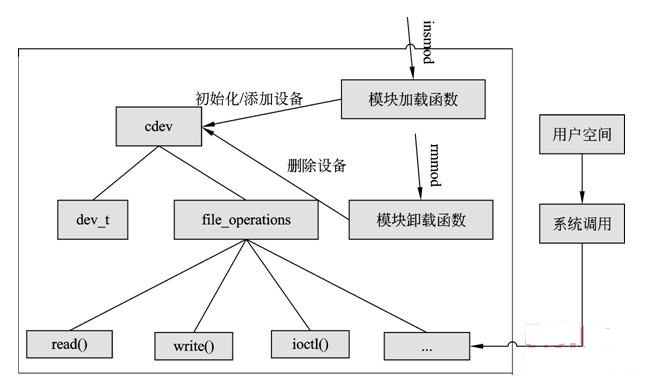 先放一张图,这张图简略描述了 cdev 结构体在字符设备驱动中的地位,及其依赖关系。这张图中被方框框起来的部分是内核空间。