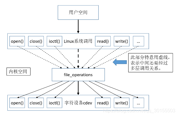用户空间应用程序的读写等操作最终会映射到内核空间的读写等操作函数,内核空间中的操作函数即 file_operations 结构体里包含的那些操作函数(file_operations 中的操作函数本身也会调用其他内核函数去执行最终的读写操作,即内核函数调用内核函数,也就是存在内核函数间依赖)。