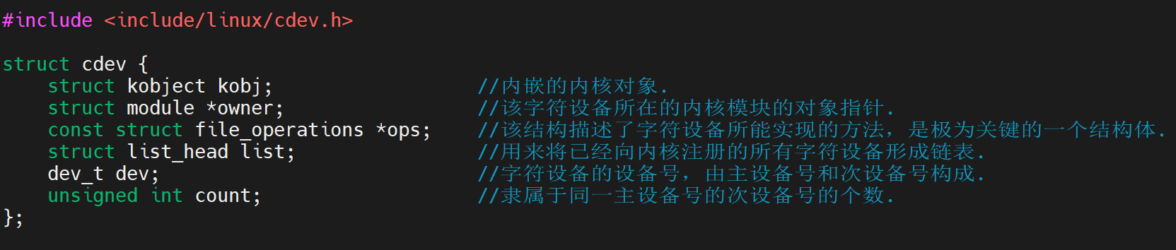 很明显,无论是加载模块、卸载模块,都是直接对 cdev 进行操作,因为它描述了整个字符设备,包括 file_operations 结构体变量。