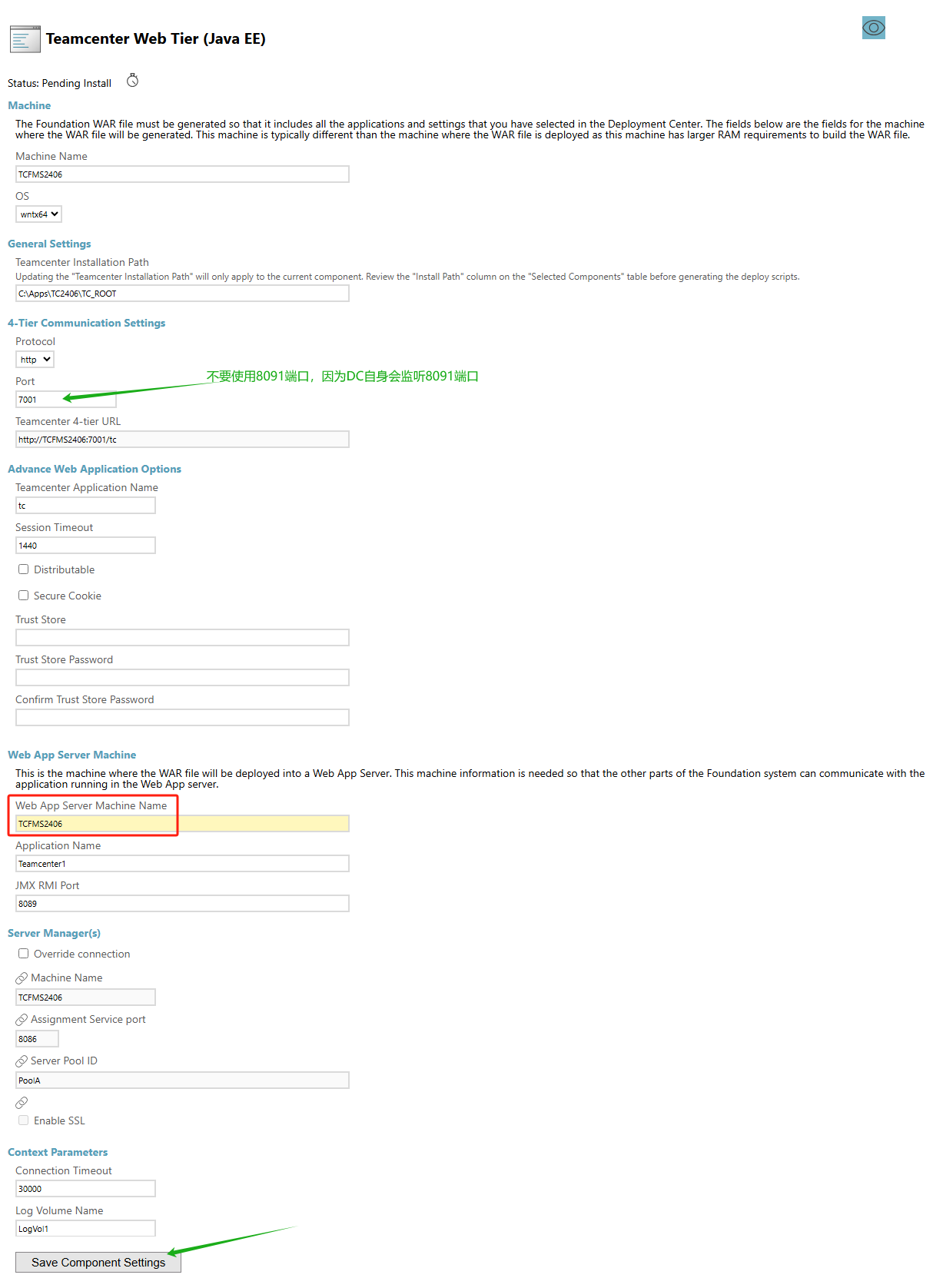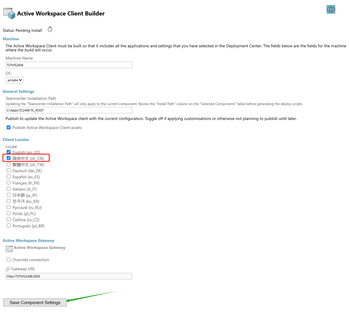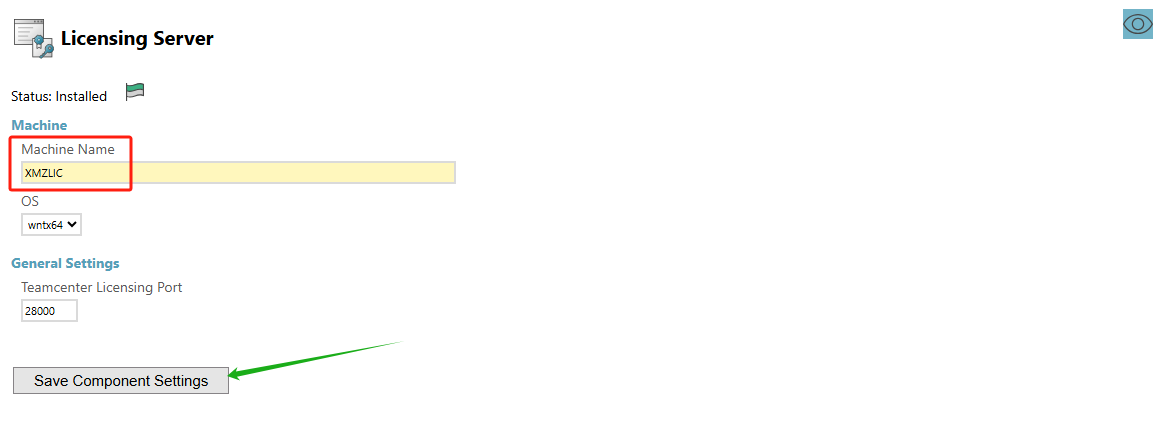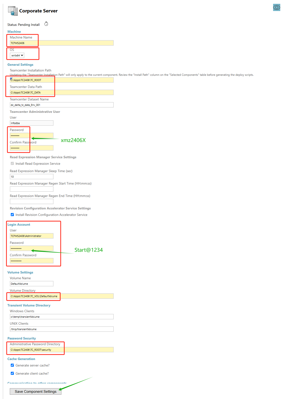 1. 从”Corporate Server“组件开始填写,左列表中选中”Corporate Server“项。右侧点上眼睛,设置机器名为TCFMS2406,OS为wntx64,Teamcenter Installation Path 为 C:\Apps\TC2406\TC_ROOT,以及其他。