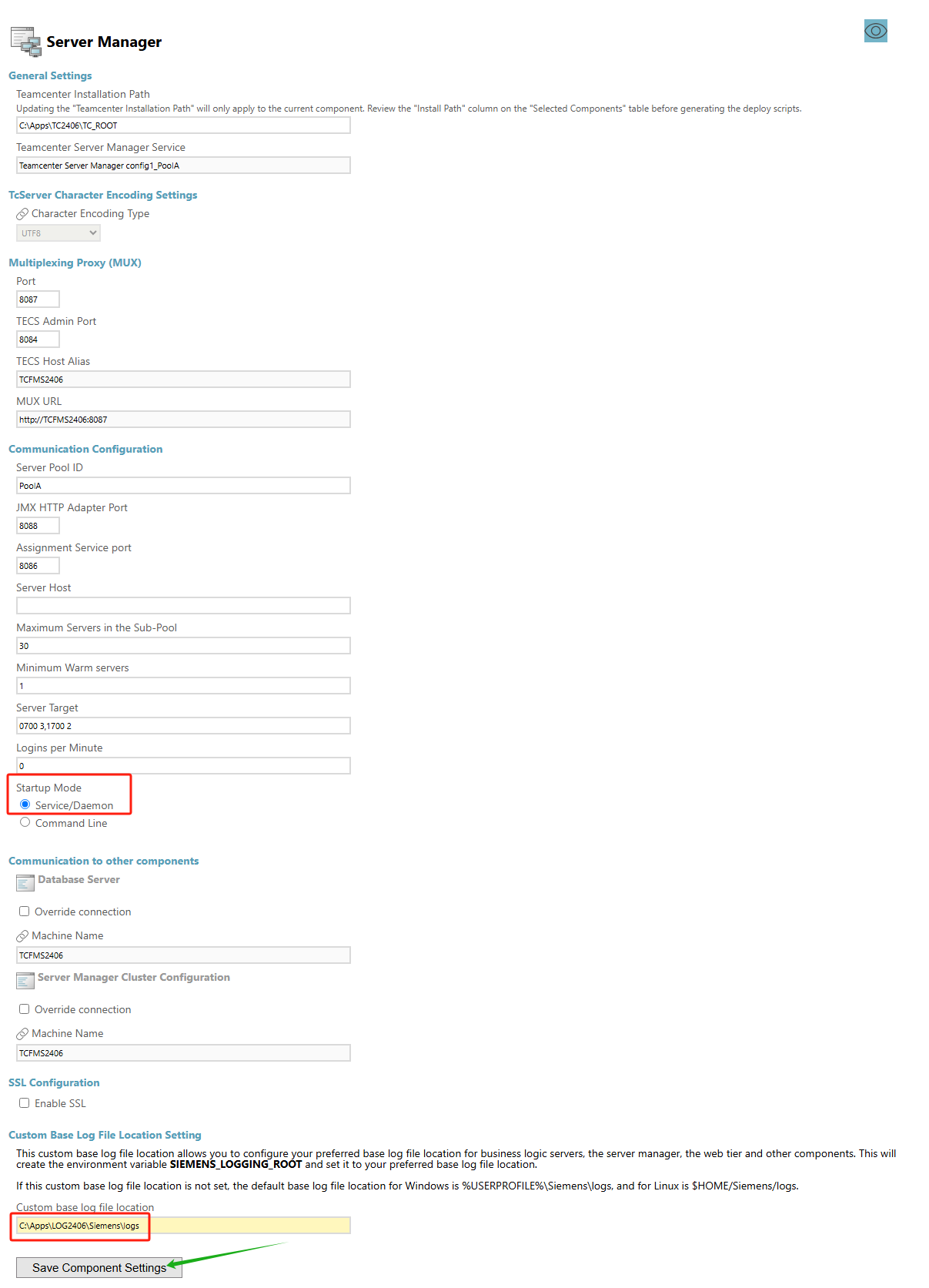 注意:初始的Custom base log file location中带有%USERPROFILE%。如果Apache Tomcat安装的时候,服务默认是Local Service身份启动的。这时需要把Tomcat服务使用的账号改为Local System用户,以避免Server Manager启动失败