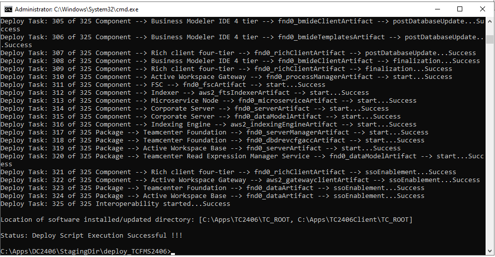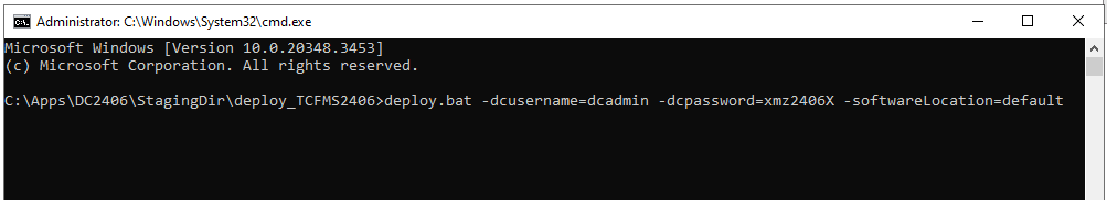 用Administrator权限启动cmd命令行,到解压后目录C:\Apps\DC2406\StagingDir\deploy_TCFMS2406,运行 deploy.bat -dcusername=dcadmin -dcpassword=xmz2406X -softwareLocation=default 这里default表示DC的默认存放安装包解压后的源路径。