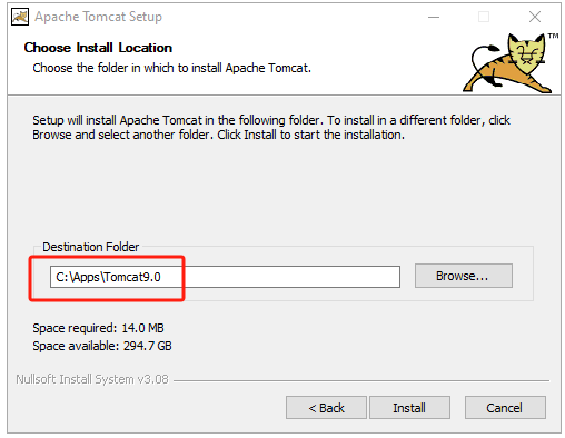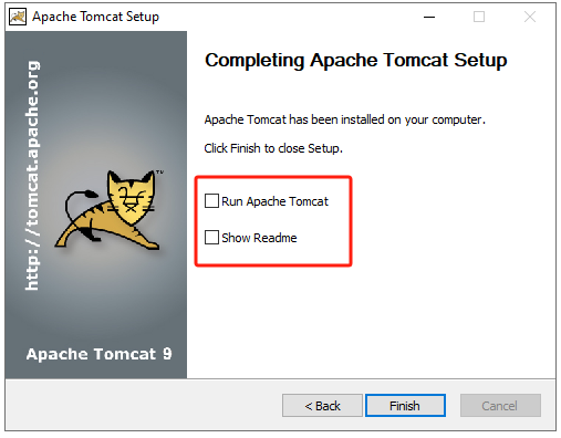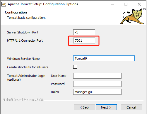 1. Tomcat安装过程中,第一处修改HTTP/1.1 Connector Port号为 7001, 第二处修改Desitnation Folder为C:\Apps\Tomcat9.0,其他默认。安装完成后取消“Run Apache Tomcat”和“Show Readme”。