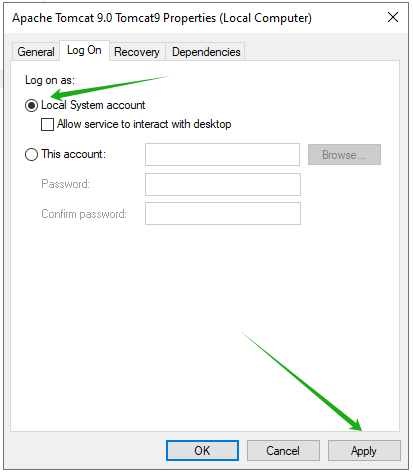 点击"Log on"分页,Log on as选择Local System account, 然后点击“Apply”按钮保存。