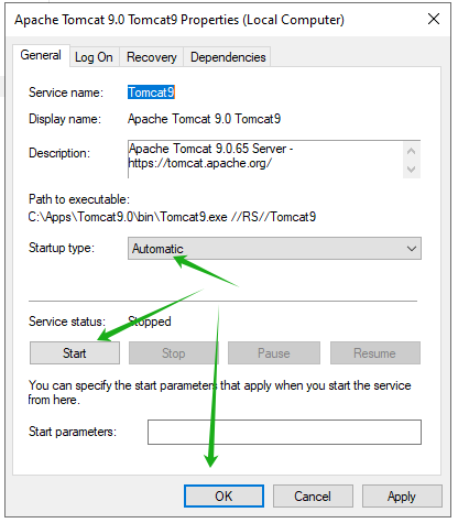 4. 设置Tomcat9 服务启动类型为"Automatic"自动启动,然后点击下方的"Start"按钮,最后点击OK按钮关闭对话框。