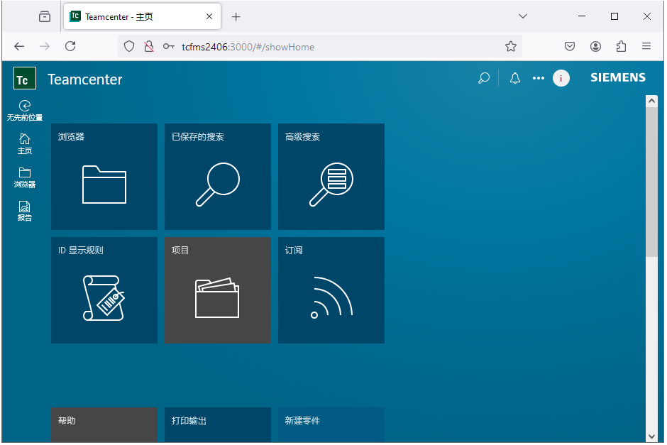 4. 验证网页能正常打开AWC。启动火狐浏览器,输入网址: http://tcfms2406:3000,用户名/密码是infodba/xmz2406X