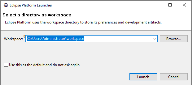 第一次启动比较慢,显示logo约1、2分钟,然后弹出选择工作区目录的对话框,设置为C:\Users\Administrator\workspace。直接点击加载“Launch”按钮。